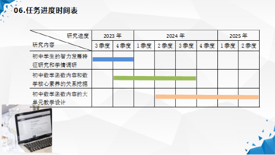 ⭐聂永成专家提到:预期成果有些单一,成果展示可以是示范课例、课件、作业设计、评价表等。研究目标和内容还是要具体,比如大单元教学实施的教学评价、单元学习的评价设计、大单元内容的设计、初中函数主体的分析、以及学习活动的设计。