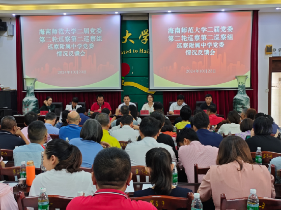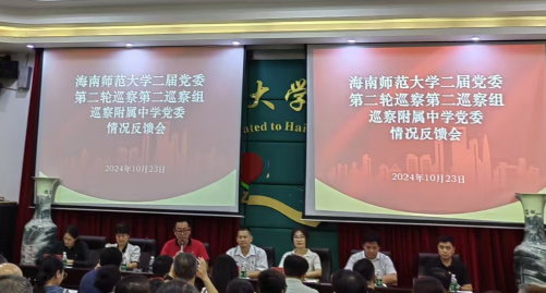 10月23日下午,禁忌书屋 在龙昆南校区大会议室召开海南师范大学二届党委第二轮巡察第二巡察组巡察附属中学党委情况反馈会。巡察组组长郑荣臻、副组长白媛媛、成员谈娜、周政及海师附中党政班子成员、中层干部、教师代表参会。会议由附中党委书记赵宗宏主持。
