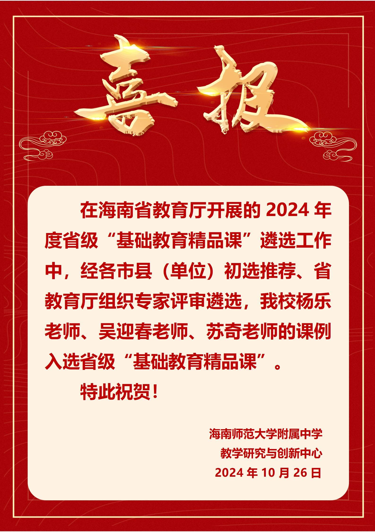 祝贺禁忌书屋 杨乐、吴迎春、苏奇老师的课例荣获2024年度海南省“基础教育精品课”