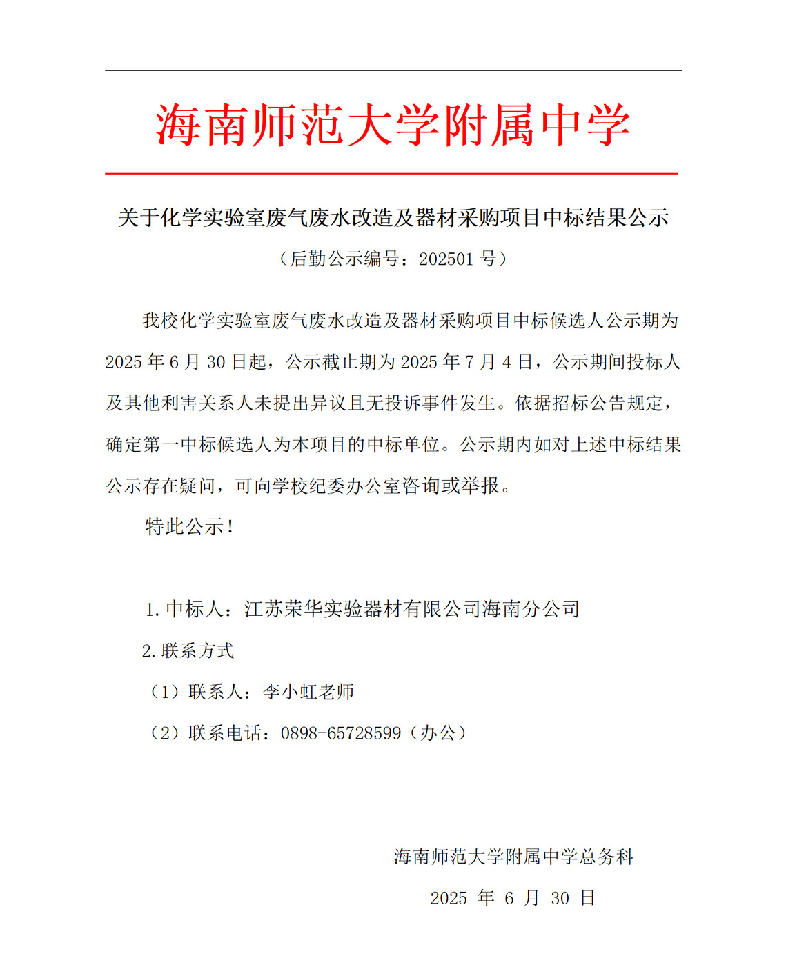 关于化学实验室废气废水改造及器材采购项目中标结果公示